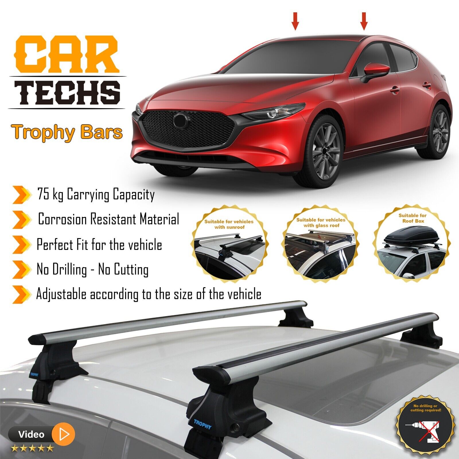 Fits Mazda 3 2004-2024 Smooth Top Roof Rack Cross Bar Carrier Rail Trophybars